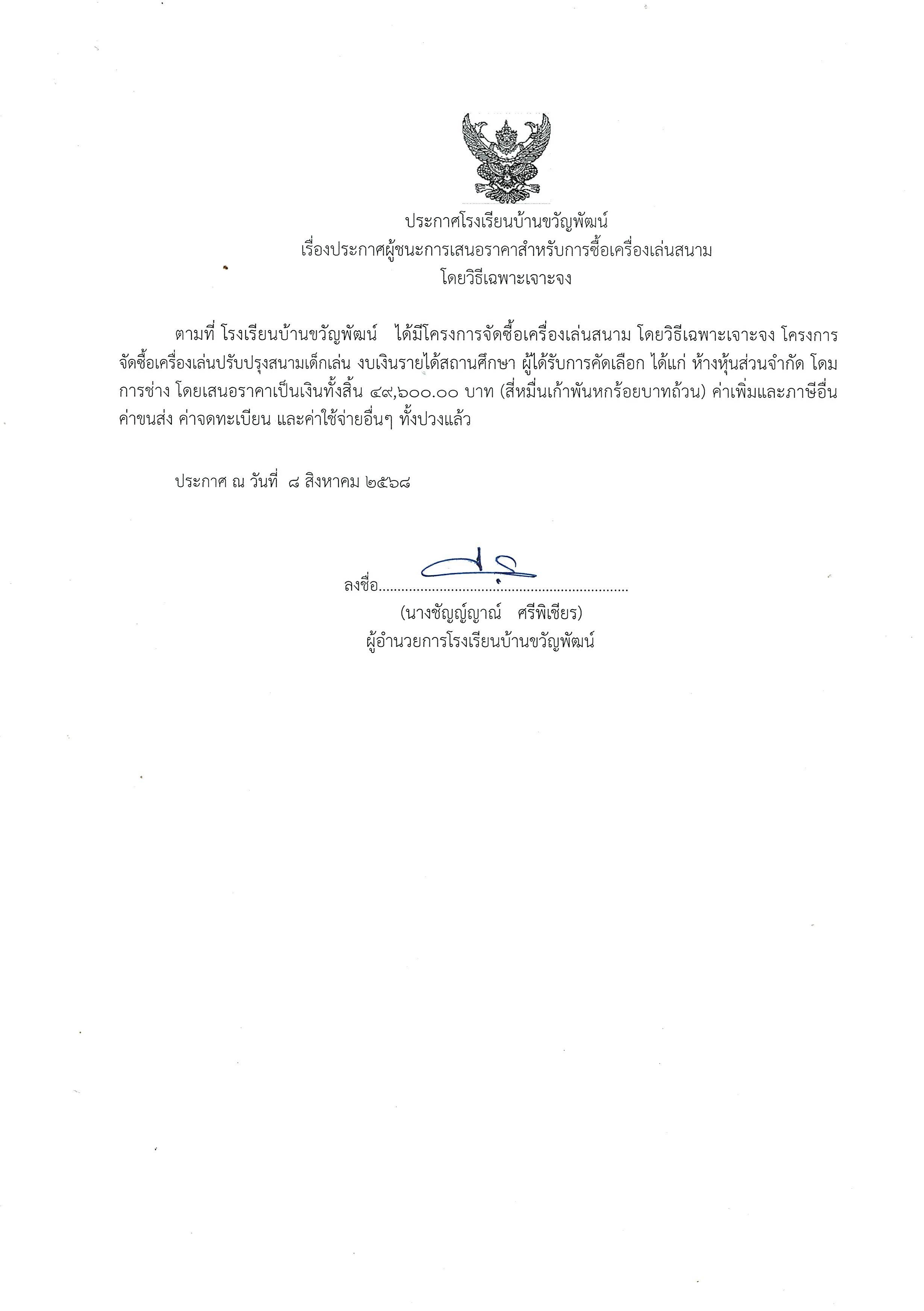 ประกาศผู้ชนะการเสนอราคาสำหรับการซื้อเครื่องเล่นสนามเด็กเล่นโดย วิธีเฉพาะเจาะจง