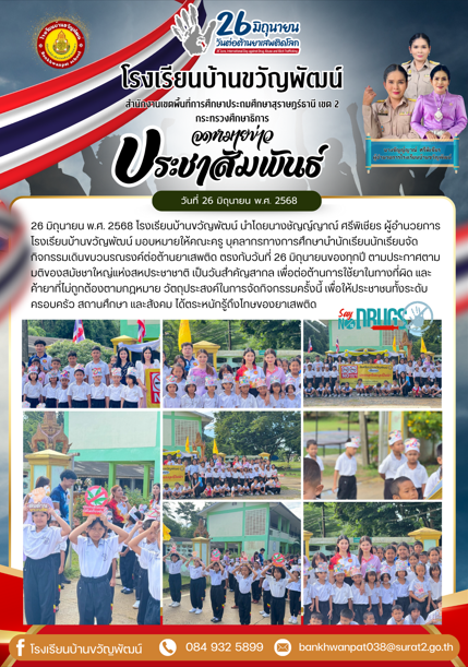 | 26 มิถุนายน พ.ศ. 2568 โรงเรียนบ้านขวัญพัฒน์ นำโดยนางชัญญ์ญาณ์ ศรีพิเชียร ผู้อำนวยการโรงเรียนบ้านขวัญพัฒน์ มอบหมายให้คณะครู บุคลากรทางการศึกษานำนักเรียนนักเรียนจัดกิจกรรมเดินขบวนรณรงค์ต่อต้านยาเสพติด ตรงกับวันที่ 26 มิถุนายนของทุกปี ตามประกาศตามมติของสมัชชาใหญ่แห่งสหประชาชาติ เป็นวันสำคัญสากล เพื่อต่อต้านการใช้ยาในทางที่ผิด และค้ายาที่ไม่ถูกต้องตามกฎหมาย วัตถุประสงค์ในการจัดกิจกรรมครั้งนี้ เพื่อให้ประชาชนทั้งระดับครอบครัว สถานศึกษา และสังคม ได้ตระหนักรู้ถึงโทษของยาเสพติด |