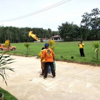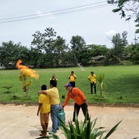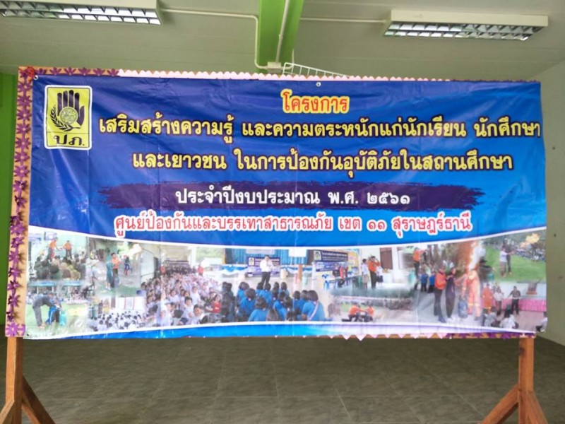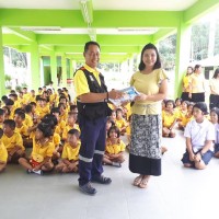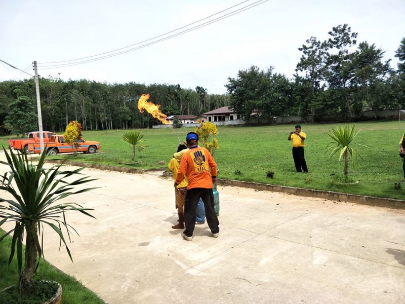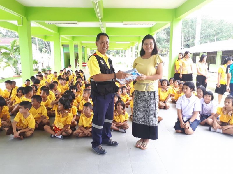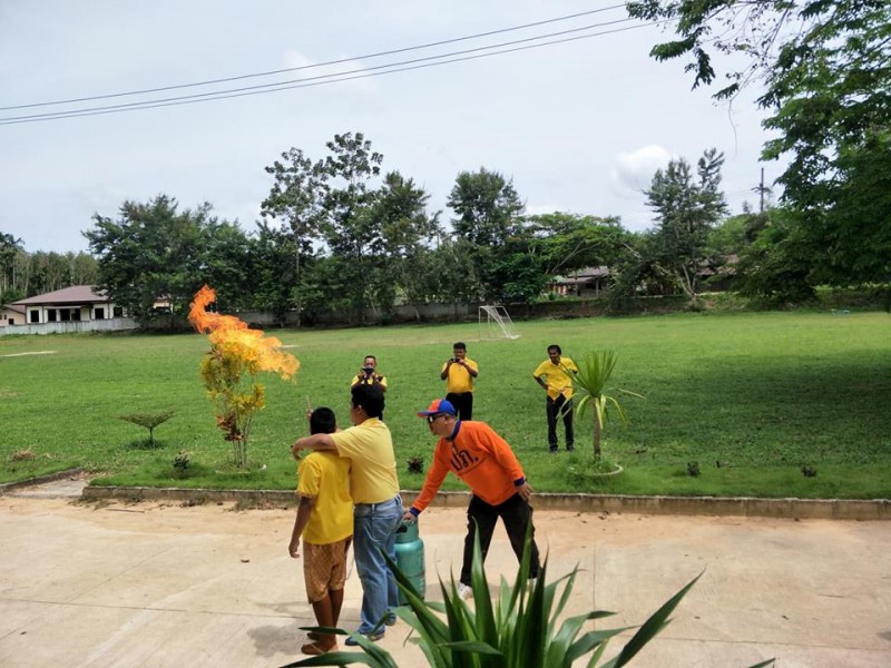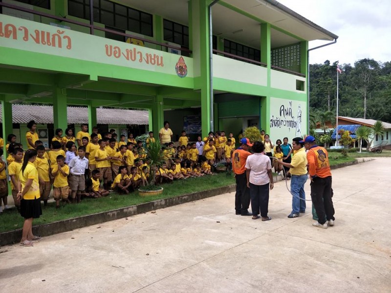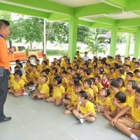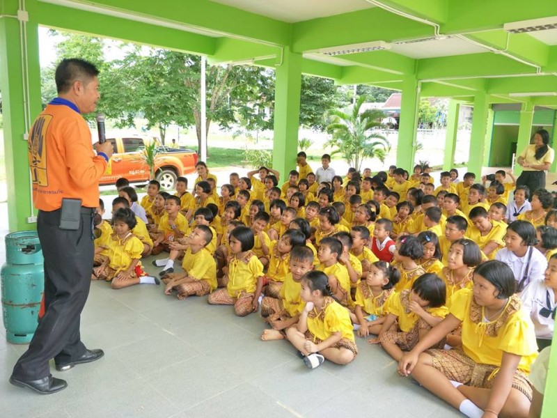 เจ้าหน้าที่จากกรมป้องกันเเละบรรเทาสาธารณภัยมาให้ความรู้เกี่ยวกับวิธีการดับไฟกับนักเรียนโรงเรียนบ้านข